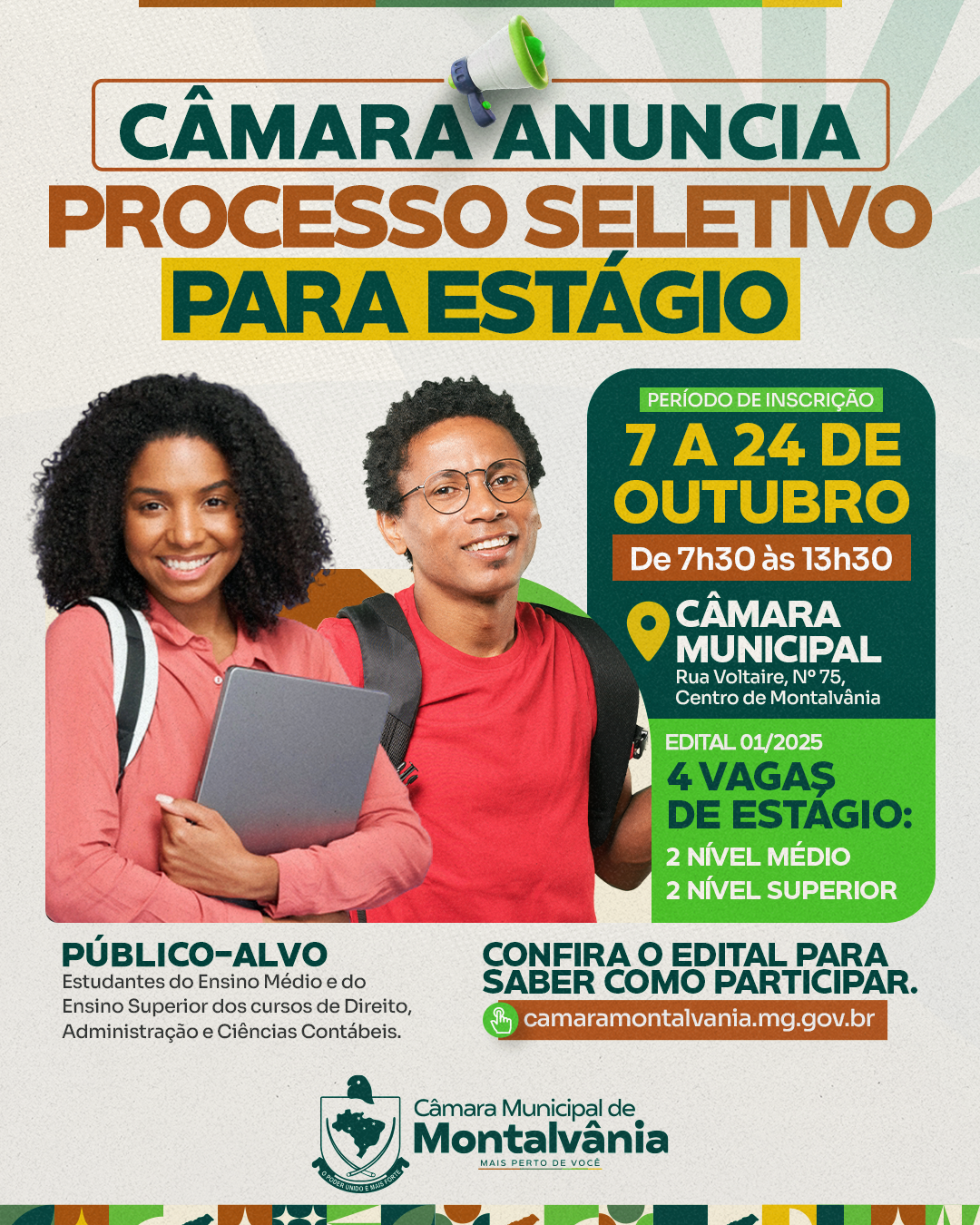 A Câmara Municipal de Montalvânia/MG, por meio de sua presidente, vereadora Renata Lima Abreu, torna público o Edital do Processo Seletivo para o Programa de Estágio,
