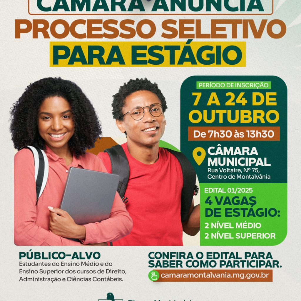 A Câmara Municipal de Montalvânia/MG, por meio de sua presidente, vereadora Renata Lima Abreu, torna público o Edital do Processo Seletivo para o Programa de Estágio, reafirmando o compromisso da atual gestão em valorizar a juventude e oferecer oportunidades de aprendizado e inserção no mercado de trabalho. O programa tem como objetivo complementar a formação […]