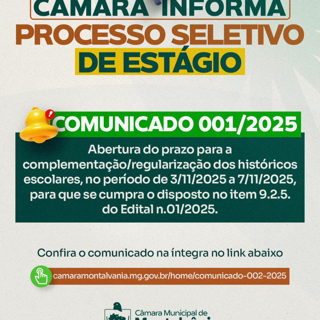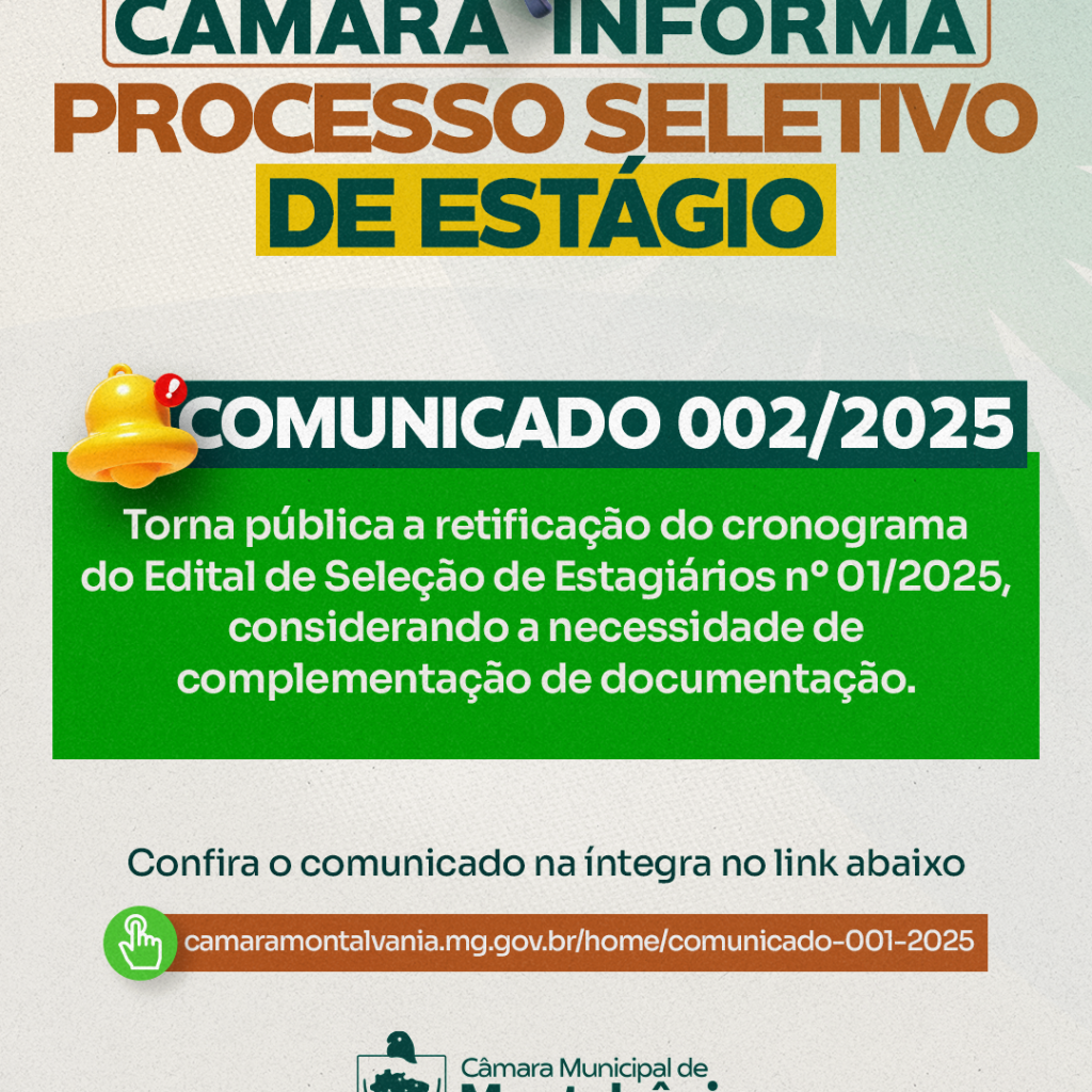 Torna pública a retificação do cronograma do Edital de Seleção de Estagiários nº 01/2025, considerando a necessidade de complementação de documentação. Confira o comunicado na íntegra clicando no link abaixo Comunicado 001 31102025 (2)