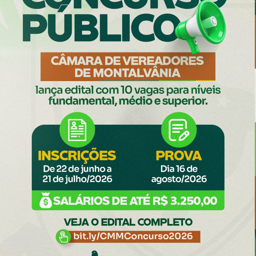 A Câmara Municipal de Montalvânia anuncia a abertura de concurso público para o preenchimento de 10 vagas imediatas, além de formação de cadastro reserva, contemplando candidatos de níveis fundamental, médio e superior. Este é um momento histórico: é a primeira vez que a Câmara realiza um concurso público, marcando um avanço importante na organização e […]